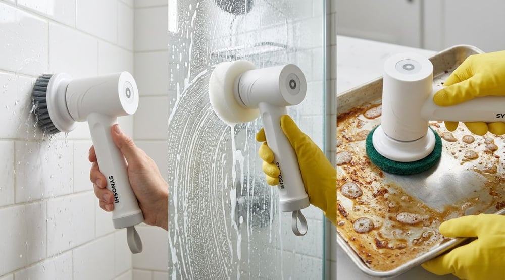 Vergessen Sie Ihr Arsenal an Schwämmen, Stahlwolle und aggressiver Chemie. Sie nehmen Synoshi, halten es an die schmutzige Oberfläche und sehen zu, wie der Schmutz verschwindet. Der rotierende Kopf erledigt Tausende von Schrubbewegungen pro Minute für Sie. Sie bewegen das Gerät nur.